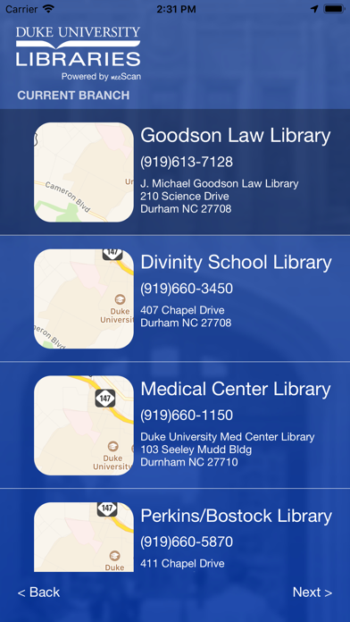 Duke Self-Checkout is a fast, easy way to borrow books from the Duke University Libraries. Currently we are piloting the app with the Marine Lab and Goodson Law Library. We plan to expand it to other libraries soon.