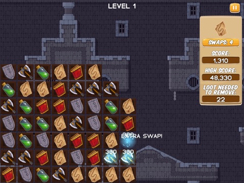 Match the target piece of loot on the edges of the grid, and collect that loot! Clear at least half the loot from the dungeon and you can move on to the next level.
