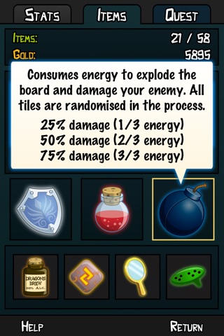Match 3 or more of the same tiles in any direction to attack with your sword, cast spells, heal or gather coins! Use special battle items such as a shield, a healing potion and an explosive bomb that can alter the battlefield! Upgrade your gear and learn tons of skills! Unlock 9 powerful classes and exploit their unique powers!