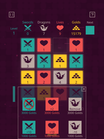Dungeon Tiles is a strategic puzzle game with minimalism and RPG elements in which players swipe the screen to collect swords, dragons, lives, and gold.
