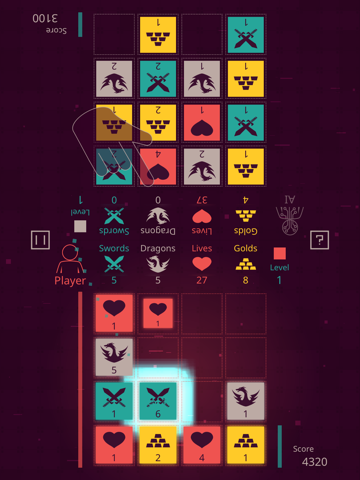 When a player swipes the screen, all of his/her tiles and all of his/her opponents tiles move in the direction swiped. Players can disturb their opponent’s play by moving the opponent’s tiles in the same direction as their own. When three or more sword tiles are combined, one dragon tile is sent over to the opponent’s arena: this tactic can be used to alter the layout of the opponent’s arena and disturb his/her play.