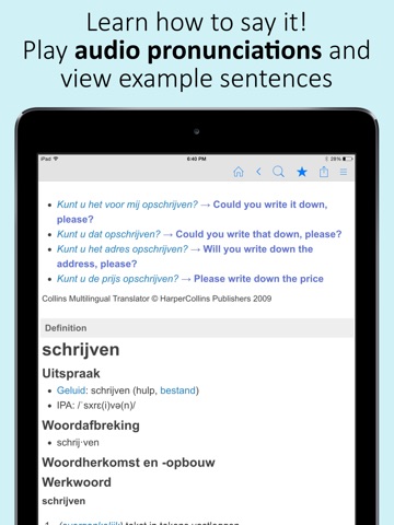 Free offline Dutch dictionary and thesaurus plus Dutch to English translations. Play audio pronunciations of words, save unlimited bookmarks, and use voice searches.