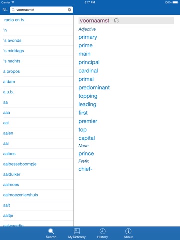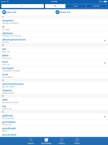 This is a very useful Dutch – English and English – Dutch dictionary, which contains 75.000 words. The dictionary is offline, so it does not require internet connection. It’s possible to add words to your own dictionary. You can learn the words in your own dictionary by using the word trainer that’s included in the application. It’s a great way to check your knowledge of the words. The application will show in what category the words are, for example: general, verb, adjective and so on.