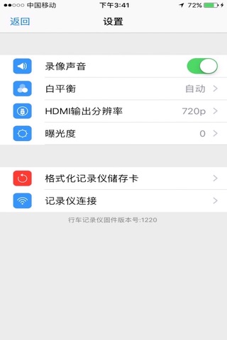4、设置:可调节行车记录仪的白平衡、曝光度、HDMI输出分辨率等参数,展示当前硬件及app版本号,还可调整行车记录仪热点相关设置。