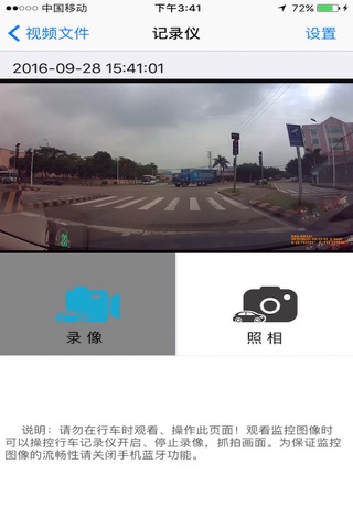 1、实时:可实时查看当前行车记录仪的图像显示,控制其录像、拍照;