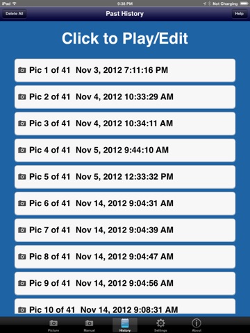 The app includes a history tab to track all generated pictures. Each is shown with the date created. A details display provides an image review, as well as the option to resend the same picture E-Mail again. A delete button is also provided to delete previously taken picture references as desired.