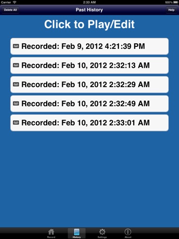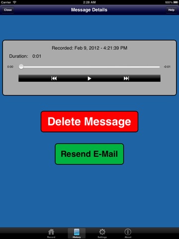 The app includes a history tab to track all generated messages. Each is shown with the date created. A details display provides step by step playback over the iPhone speaker, as well as the option to resend the same voice memo again. A delete button is also provided to delete previously sent messages as desired.
