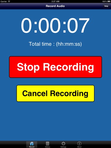 The app, by default, begins recording the voice memo as soon as it is started. A short beep will be heard to signify the start of the recording process. A stop button is visible to manually stop the recording process and send the message. If the manual button is not used, the recording will continue until it reaches the maximum time from the Settings tab. The default duration is 2 minutes, but can be set to any value between 1 and 10 minutes.