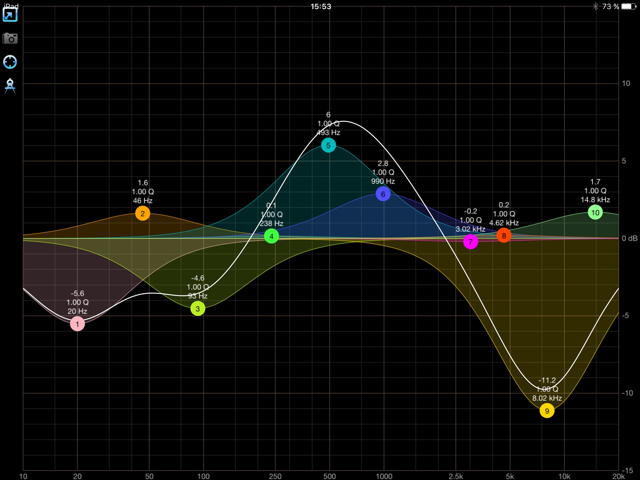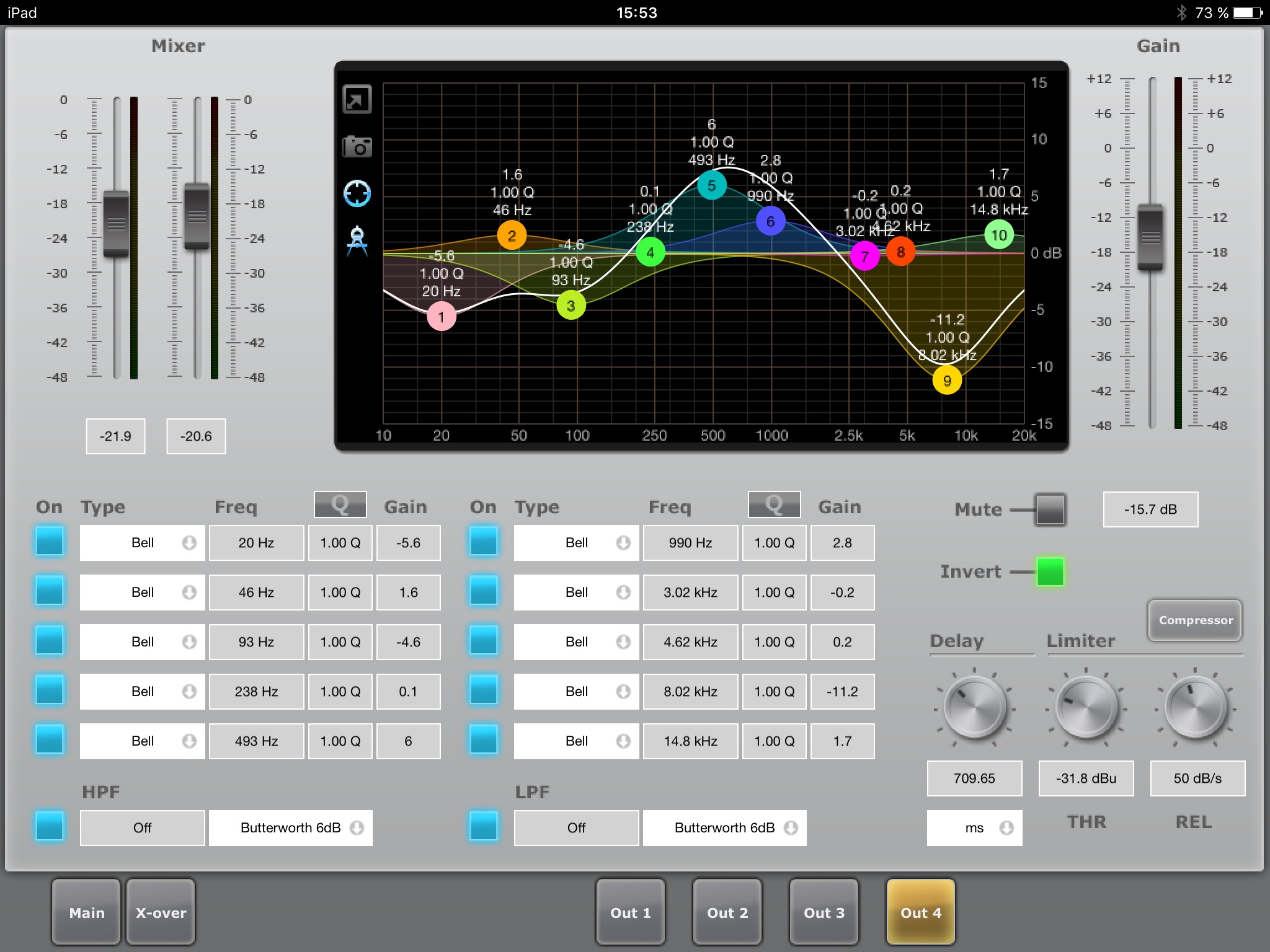 • 10 equalizers per each channel with the filter types: bell, high-shelf, low-shelf, notch, all-pass, band-pass, high-pass, low-pass