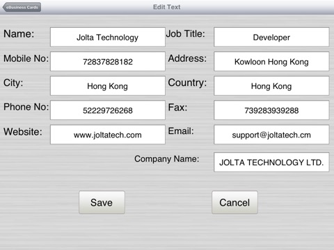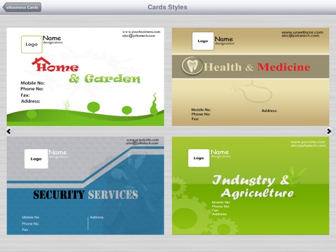 App is very limited! Not worth the money. Info boxes are set so you cant choose what is visible on the card. For example I dont have a fax line but the word Fax still shows on the card like I just forgot to put the number in there. For a paid app should have way more card styles to choose from. This will be great after a little more development. Hoping there is more to come for my $1.99!!!