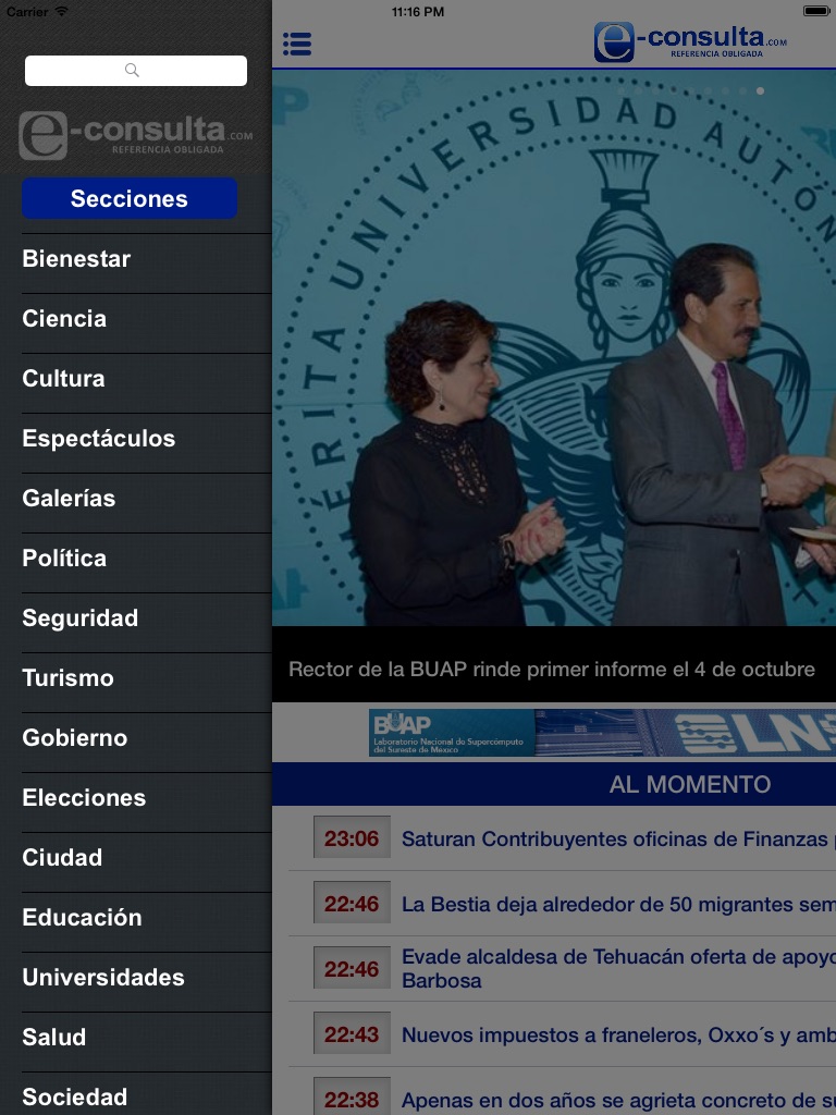 Periódico Digital de Noticias de Puebla,Periódico Digital e-consulta, sitio de Referencia Obligada en noticias minuto por minuto de Puebla, Tlaxcala, Oaxaca Veracruz y el mundo, con secciones de Política, Gobierno, Ciudad, Educación, Universidades, Salud, Economía, Sociedad, Ecología, Seguridad, Nación, Mundo, Cultura, Turismo, Ciencia, Columnas, Artículos, cartones, videos, fotogalerías, gráficos, foros, blogs, chats, redes sociales, Twitter, Facebook, comentarios en notas, obituarios.
