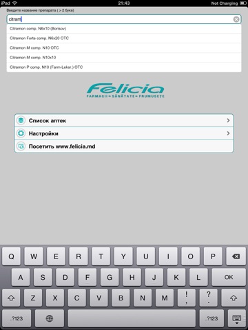 Официальное приложение сети аптек «Felicia» позволит осуществить поиск лекарств, покажет цены и наличие медикаментов а так же других товаров в аптеках «Felicia». Удобно и просто!