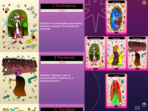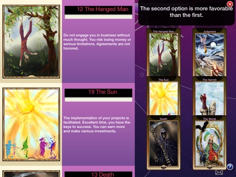 • A quick question on love, money or work? The Major Arcana’s cards will give you a answer quickly with a pertinent reading on the chosen theme.