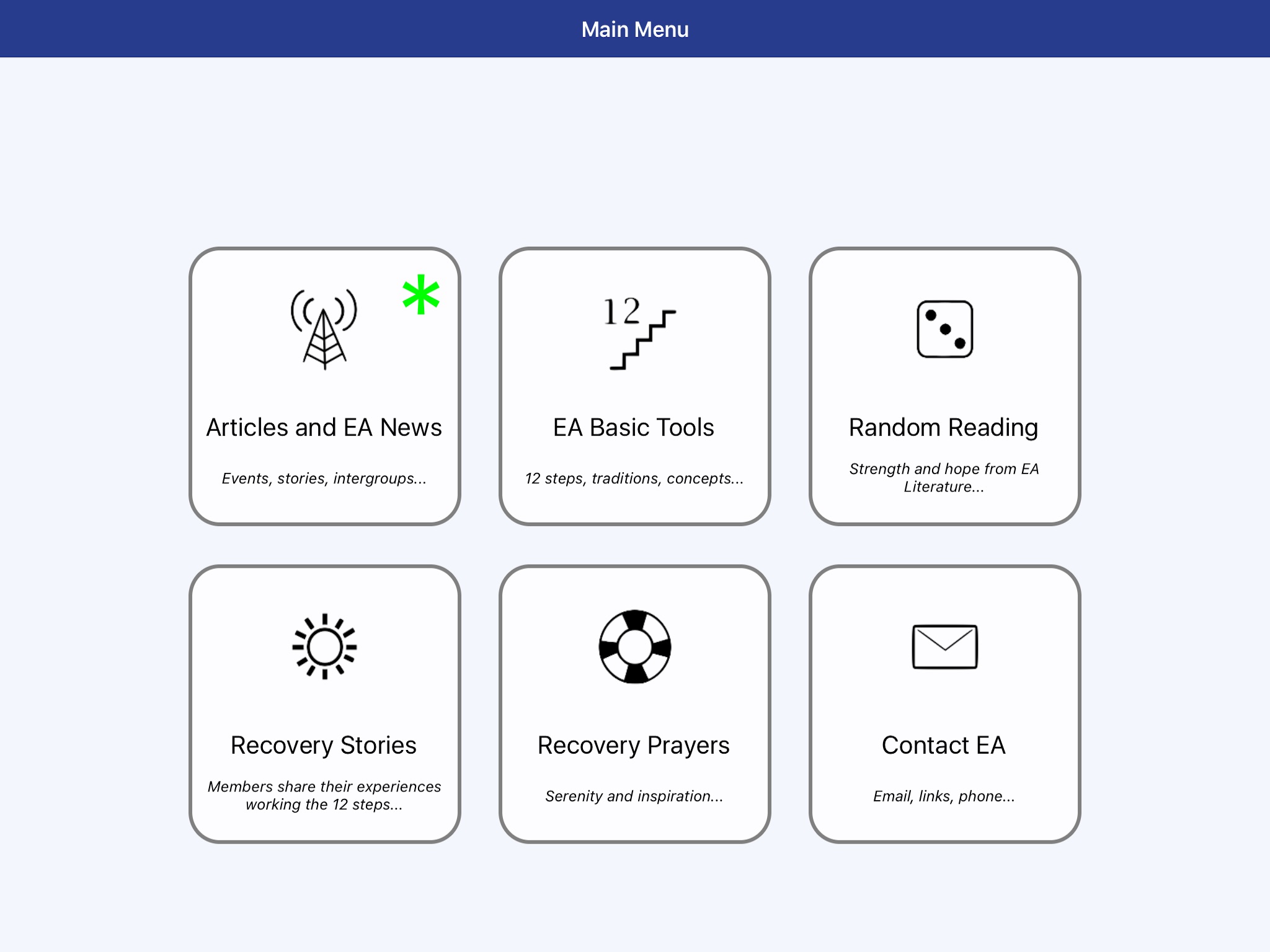 * The 12 Steps, 12 Traditions, and other tools of the EA program