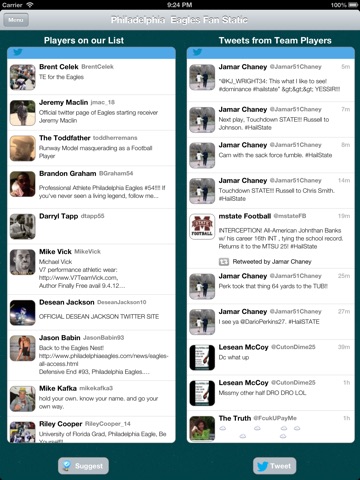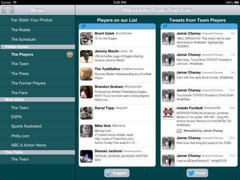 Philadelphia Eagles Fan-Static keeps you up to date and allows you to get involved and show off your true fan spirit! Follow Twitter Feeds from the Current Players, Management, Local Beat Writers, Former Players and FANS like you! Youll never miss a news items, fact or tweet with Fan Static.