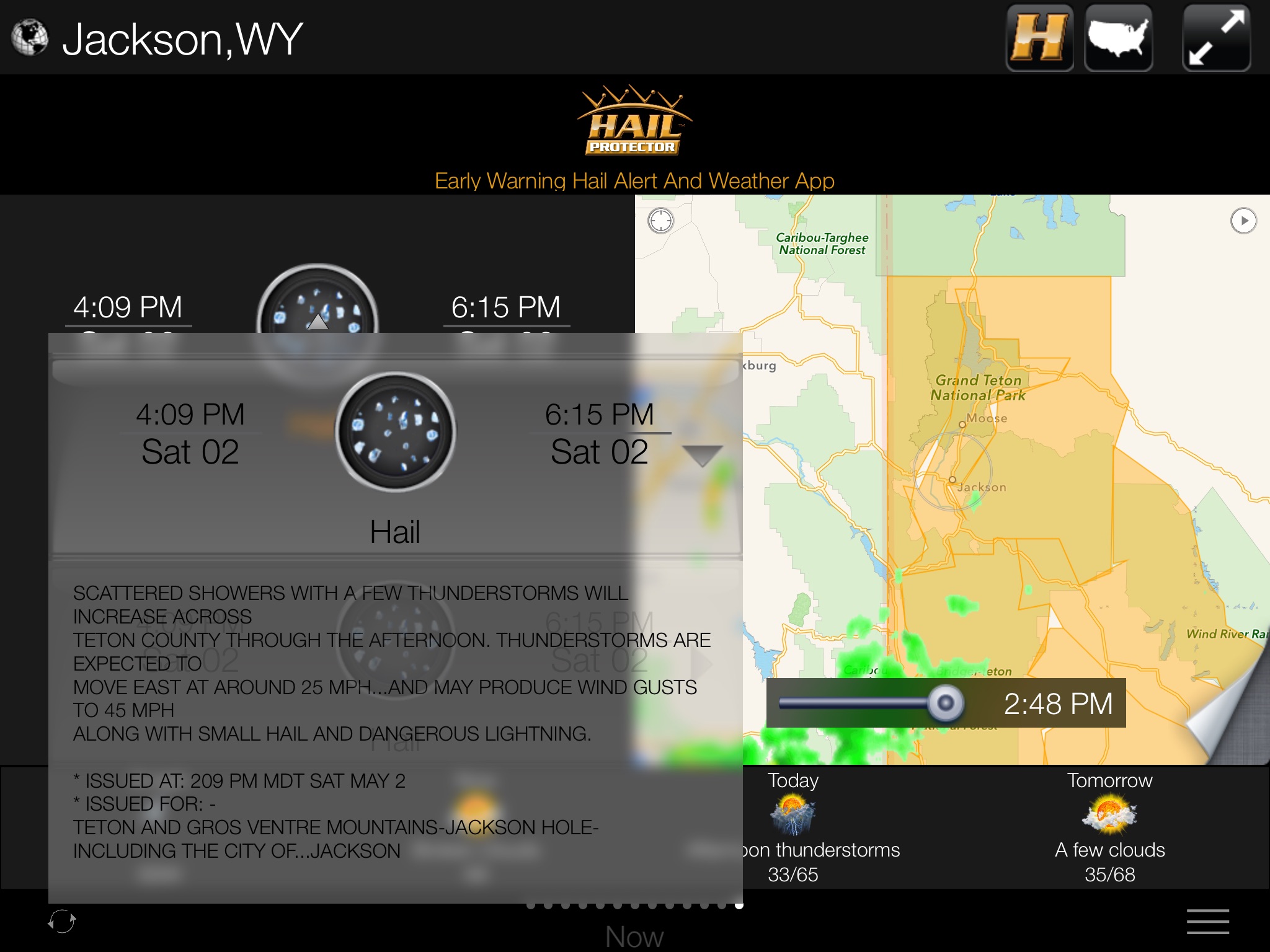 In addition to early warning hail alerts, the app provides alerts for tornadoes, thunderstorms, severe weather, flooding and wind. There are lots of apps that tell you where it has already hailed, but not where hail could be expected. The Early Warning Hail Alert and Weather App by Hail Protector is the only one specifically designed to alert you to potential hail events. Its the warning you need to protect your family and your property. You are able to enter over 10 locations for monitoring. The app provides animated radar, "Todays Hail Forecast" direct from the National Weather Service, and the weather forecast for the next 48 hours for all of your entered locations.