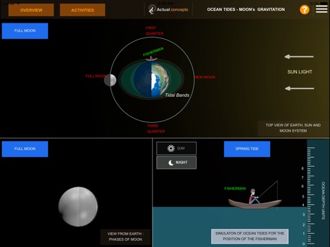 Touch the Moon, Earth or Planets to control and maneuver them to understand how the motions of these heavenly bodies cause seasons on earth, Tide formations etc.,