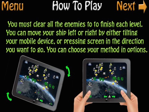 Earth Invaders have reached your solar system...You must defeat the oncoming space invaders before they destroy the Earth. Tilt the screen to control your ship and avoid enemy missiles and fireballs.