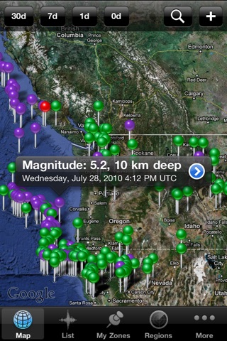 Ive tried 4 other earthquake apps and they all seem pretty similar. They all show pins on Google maps with the earthquakes in the past week. This one is different, for the simple reason that you can select any time period and magnitude range you want. It is also highly configurable– you can change the time period and magnitude in the settings.