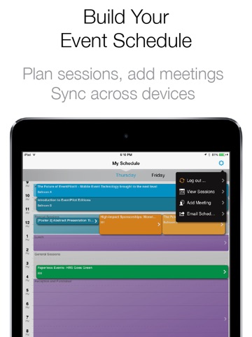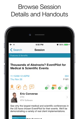 • Program: Browse the entire event program to build your personal schedule, bookmark sessions or speakers, or access session handouts as available.