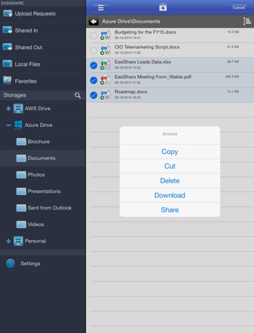 EasiShare app allows users to perform enterprise file share and sync on their corporate files from both iPhone and iPad. EasiShare also connects to CIFS, Sharepoint, Office 365, Microsoft Azure and AWS S3.