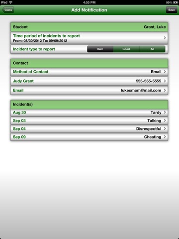 • Send notifications to parents directly from the app. The app will automatically generate an email that includes the incidents for a student for a given date range that you can quickly send to parents. You can always edit the email and add extra comments as well. You can also launch a phone call directly from the app without having to search elsewhere for parent contact information.
