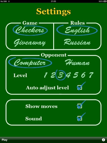 Вот плавная-то анимация как раз и раздражает: от крутящейся доски кружится голова. Кнопки меню не работают, пока не закончится анимация последнего хода. Так же нельзя сделать ход, пока не закончилась анимация хода противника. Дизайн хорош, но простоват: зелёный фон слишком насыщенного цвета и плохо сочетается с доской. А вот к движку никаких претензий: играет очень хорошо. Хотелось бы видеть тут ещё и международные шашки 10x10 с такой же силой игры.
