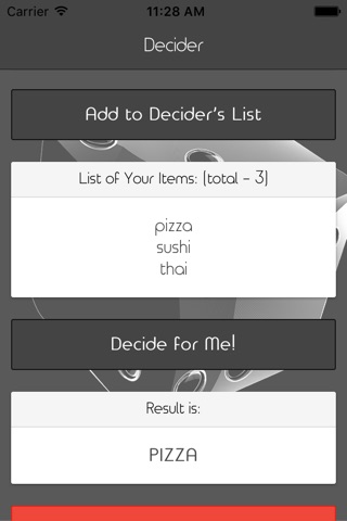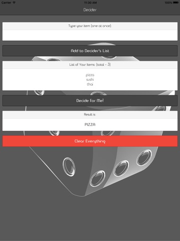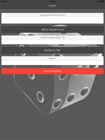 If you are having trouble making an important (or not-so-important) choice, Decider is here to help! This quick and easy-to-use app will randomly choose for you. Just enter your options and click the decide button. No more fighting over what restaurant to eat at or movie to watch. No more existential struggles about whether to buy that shiny new toy. Whos doing the dishes tonight?