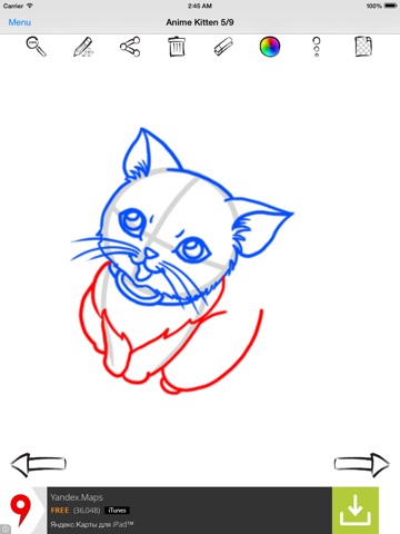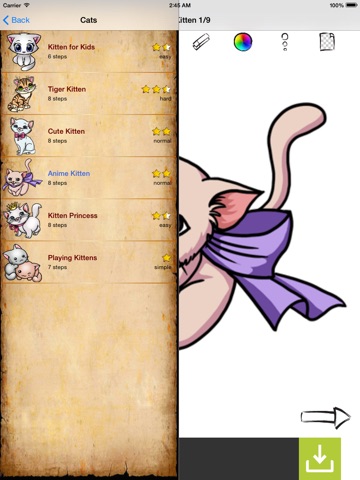 Learning to draw with our apps consists of following of each step presented in the tutorial for the subject you want to learn to draw. The number of steps varies, but each one covers a key aspect of the subject. Even complex subjects such as Anime Kittens are a snap!