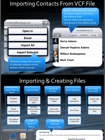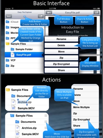 Easy File provides file organization and exchange for iPhone & iPadis with multilevel folders. It supports ZIP and unzip of files and can preview most document formats. It provides many ways to share documents. It is integrated with the popular cloud drives such as Dropbox, SkyDrive and GoogleDrive, and can browse and exchange files with these cloud drives contents. The pro version supports encrypted zip compression of files. It is a must have companion tool to iPhones & iPads. It also makes renaming, moving and copying of files as easy as it were on a desktop.