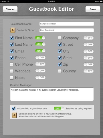 Easy Guestbook can be used offline. The collected data is directly saved into your iPad/iPhone Contacts (Address Book). Each guestbook can be assigned to a different Contacts Group allowing for clean separation of the collected information. Use all the familiar functions within Apple’s Address Book to process the collected data. With the power of iCloud you can push the collected information to all of your devices.