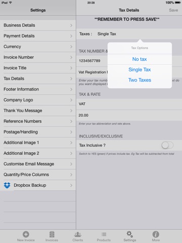 * Ability to include nil tax, 1 tax or 2 taxes on the invoice.
