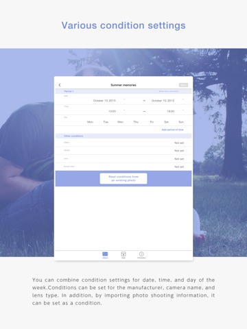 Based on information such as the shooting time and camera used, you can easily filter to folders by specified conditions, so by filtering such as by weekday daytime, weekday nighttime, or days off, this makes it possible to categorize photos for private and work, etc. and you can easily organize the photo data on your device by conditions that you set one time.