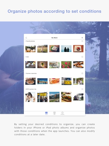 - By setting your desired conditions to organize, you can create folders in your iPhone or iPad photo albums organized with those conditions.
