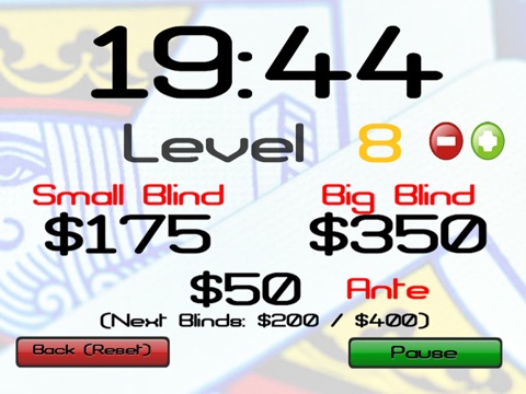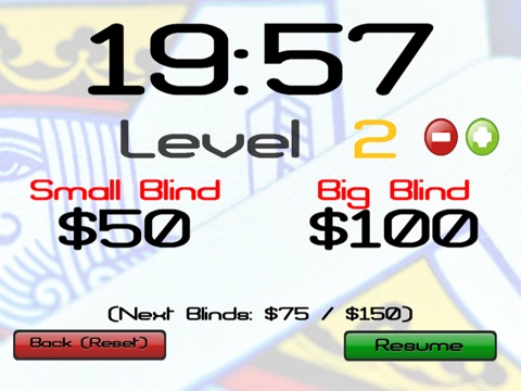 The Easy Poker Timer - Texas Holdem Tournament Clock is the easiest way to add fun and excitement to your home poker game. Just like in the casinos, the Easy Poker Timer will show the current Small Blind and Big Blinds, as well as blind level and time remaining for that level. It has a large timer which will show you exactly how much time is left before the blinds go up. Super easy setup needs just four options (tournament length, blind level length, starting chip stack size, and antes). Tournament length can be 2, 3, or 4 hours. Blind level length can be 10 minutes, 15 minutes, or 20 minutes. Starting chip stack size can be $1,500, 2,500, or $5,000. You can also select whether you want to include antes (at the 4th level).