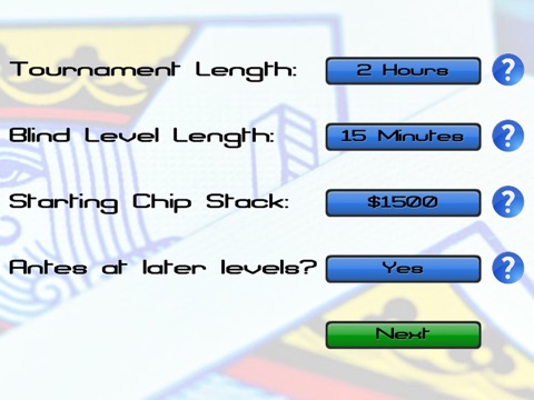 • Simple setup-just choose your options and start the tournament-no need to specify your own big and small blind values.