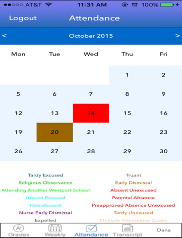 -View attendance for each month with color-coded key corresponding to the absence reason