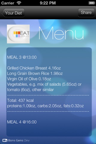 ...and see your diet generated using more than 25 (you can add more products if you want to) simple healthy products especially for you. Huge number of plates combination without daily options limitation. You don’t like first proposition, just shake your phone to generate other! If you like it, you can share your diet using email and Facebook.