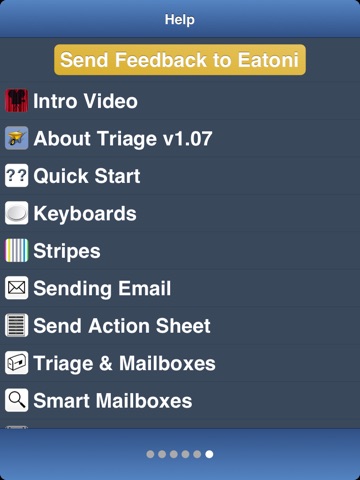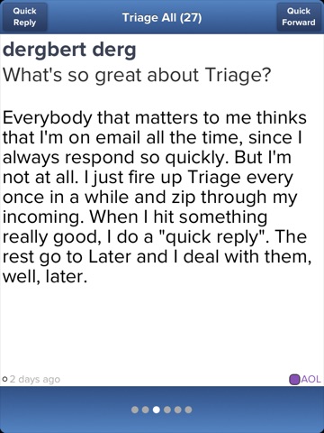 Triage was born from walking around New York trying to do a meaningful amount of email while stuck at a light or behind a knot of tourists. You dont want to have to select a mail and open it up to read it. You just want to get the gist immediately. You want to be able to delete a mail with one swipe. Or save it for later, with one swipe. For some mails you need to respond with a few words straight away. That should take no more that two taps. Or forward it in two taps. You want the option of big easy-to-hit keys. You come up with an idea or remember something you need to do and want to send a note to yourself right now. Two taps. Thats Triage in a nutshell.