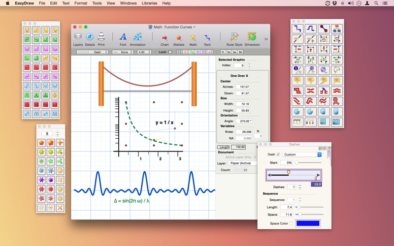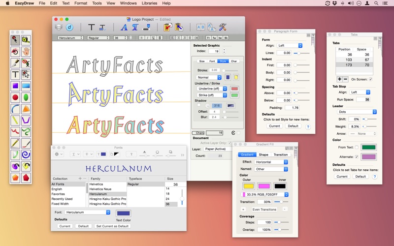 EazyDraw provides a balanced feature set that includes tools needed for technical drawing, web and App graphic design, print publishing, logos, page - text layout and more. Easy enough for everyone but with the depth your project will need.