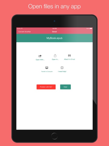 Save, Share or Open your converted ebooks in your favorite reader apps immediately. You can even browse your previously converted files with our in-app file browser.