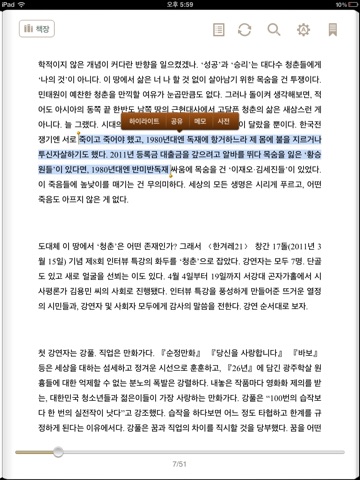 - SNS 기능 : 페이스북, 트위터, 미투데이 등 주요 SNS에 글을 올리고 함께 의견을 공유하는 소셜 리딩 서비스 제공