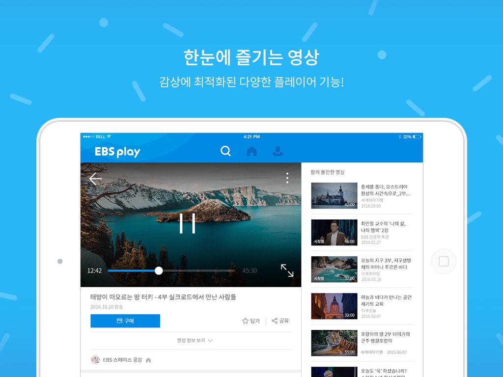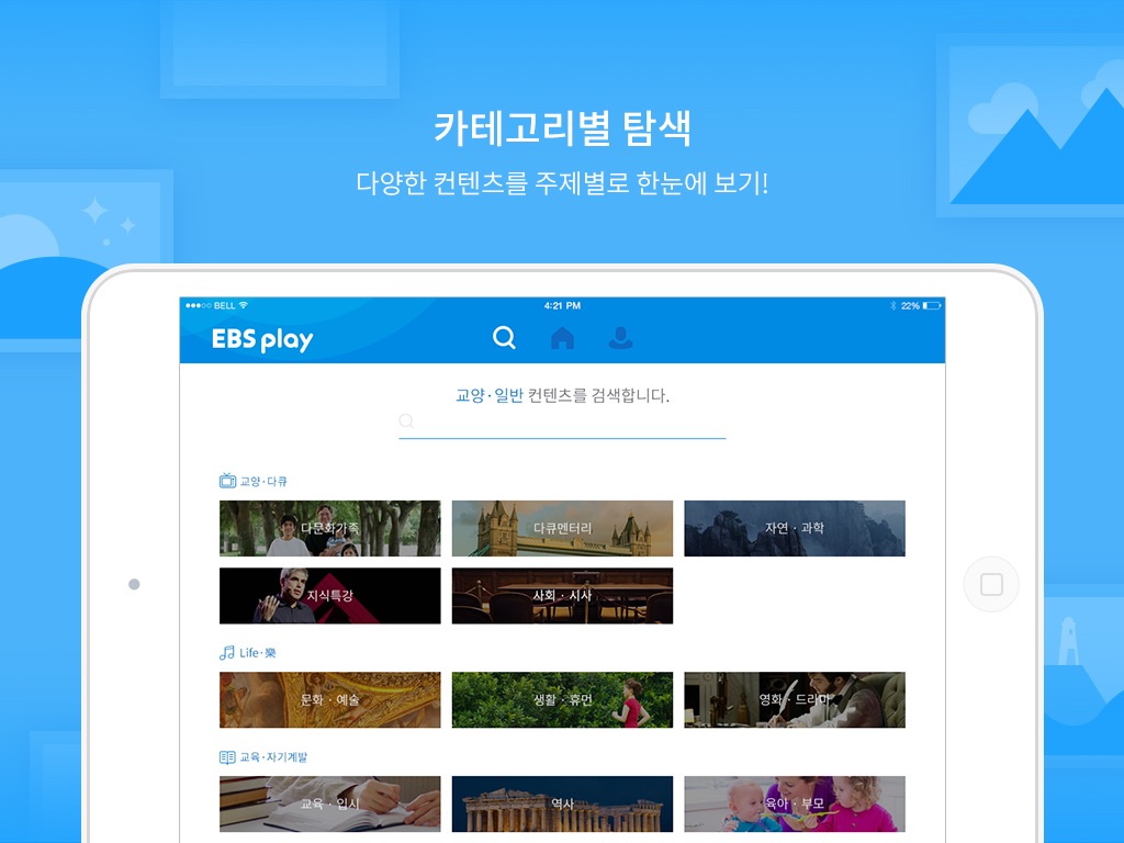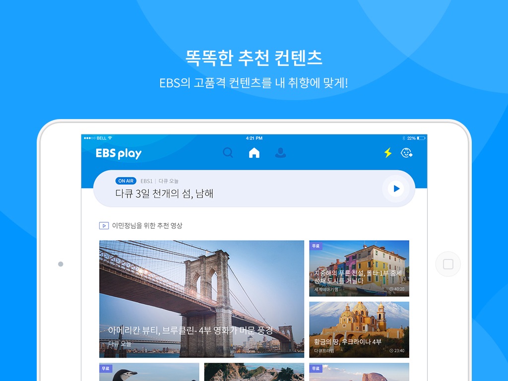 EBS play provides a variety of different VOD contents as well as real time broadcasting of EBS1, EBS2, EBSU, PLUS1, PLUS2 and EBSe.