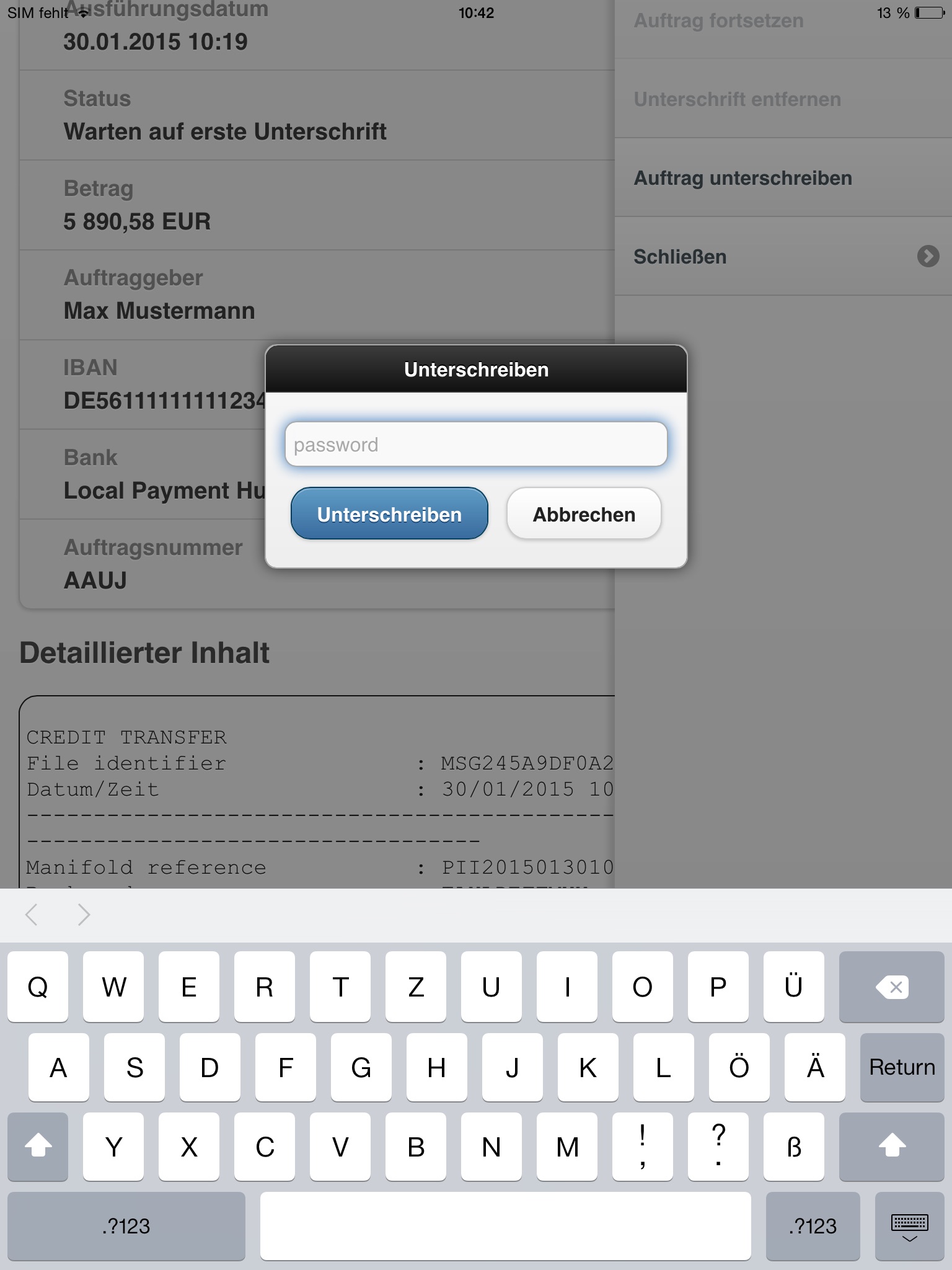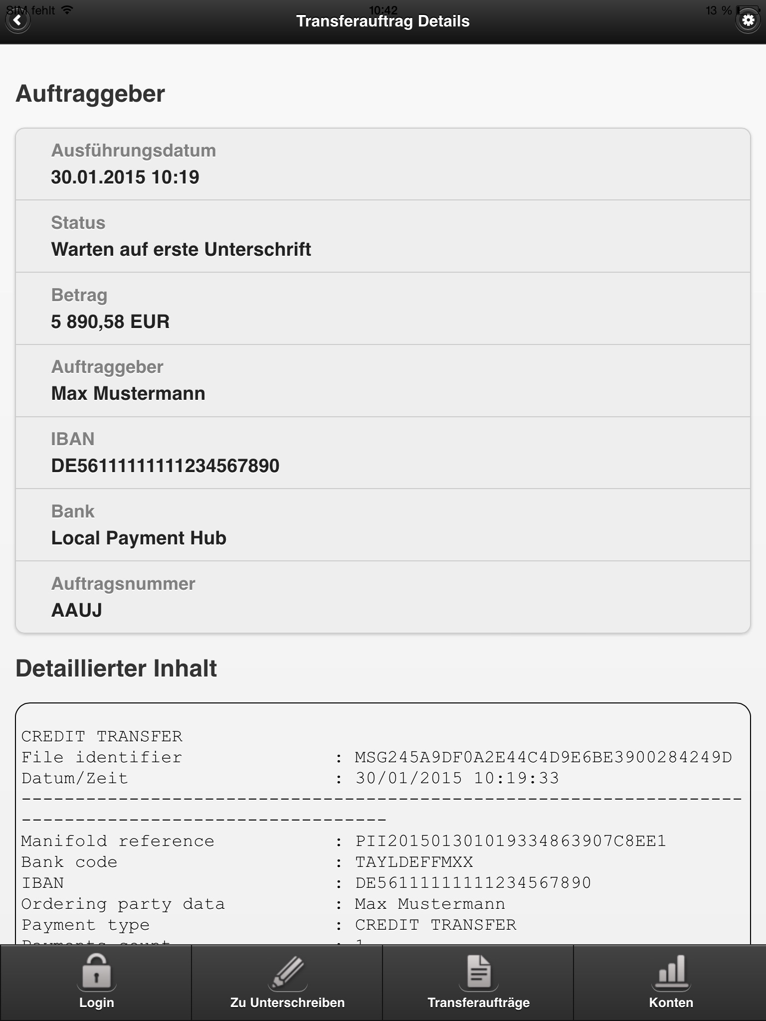 • Sichere Datenhaltung: weder Zahlungsdaten noch Unterschriftsschlüssel liegen auf dem mobilen Endgerät sondern ausschließlich auf Ihrem Firmenserver