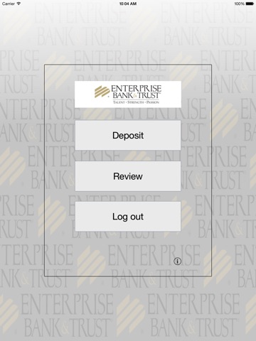 POINT. SHOOT. DEPOSIT. This application will allow Enterprise Bank & Trust clients to remotely deposit checks via their iPhone. It is intended for Enterprise Bank & Trust clients only and requires the Remote Deposit Anywhere (RDA) service. Please contact Enterprise Bank & Trust for additional information.