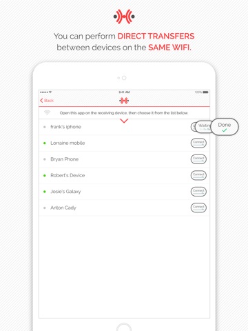 Echo Transfer (powered by Fenix Data) lets you wirelessly transfer photos, videos, documents, and contacts to other computers and iOS/non-iOS devices. You can also use your computer (via web browser) to transfer data to your devices and you can view or manage you device data from your computer. There is no need for a Cloud service, USB cables, iTunes or any extra software.