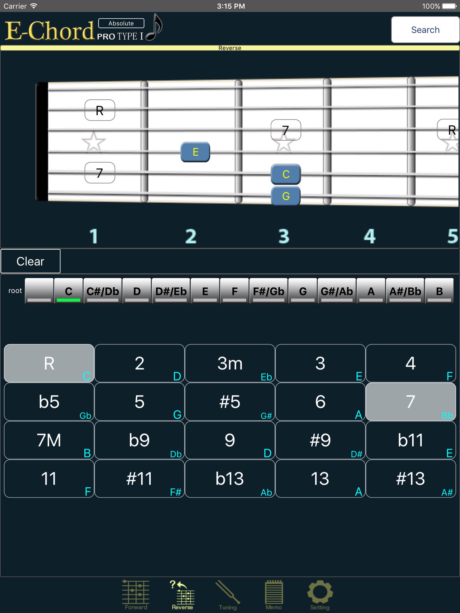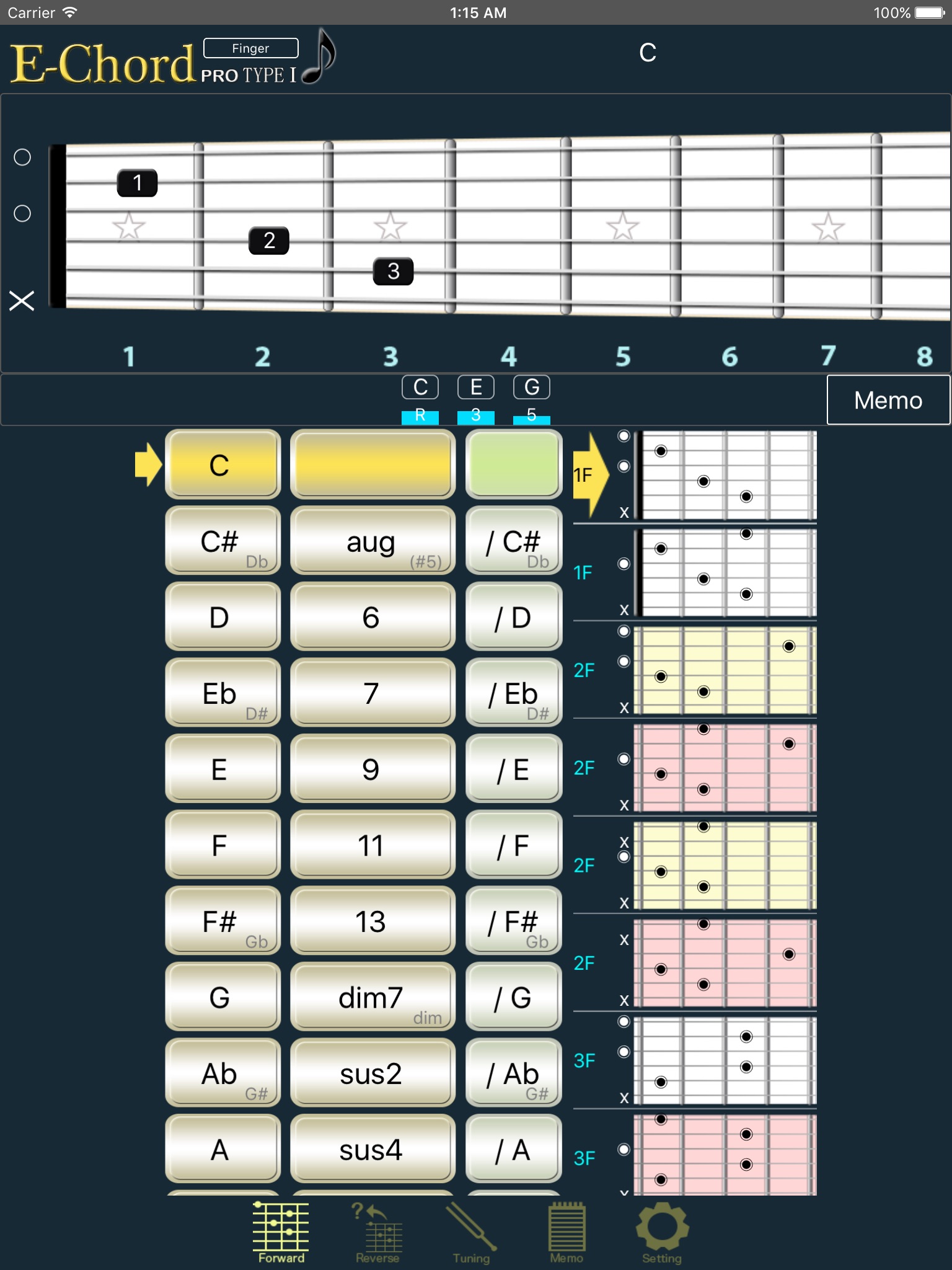 This chord app is distinctive for the fact that it doesnt use a premade database of finger positions; rather it takes the selected chord and calculates correct finger positionings, with the relative difficulty of each classified by color. You can do reverse lookups from any of the 24 frets, and the program can also handle "fraction" chords (D/C, C/E, etc.). The app can also display finger positions for alternate tunings.