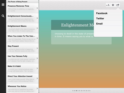 The Power of Now Inspiration Deck contains fifty cards with insightful quotations from Tolle’s classic designed to pull you into the moment to become calm and centered. This app will serve as your guide to enlightened living, and help you to experience The Power of Now anywhere and anytime.