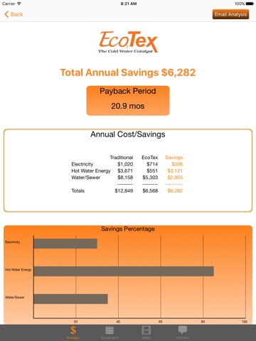 EcoTex Ozone app will calculate potential savings and recommend a best EcoTex System based on a variety of information from which you select, including number of washers and washer size, facility type, number of shifts, rebate, discount, tax rate, and installation costs.