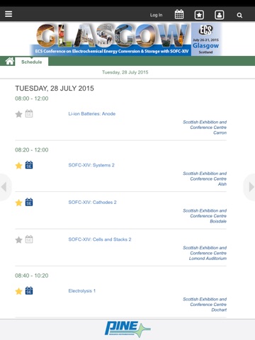 The ECS Conference on Electrochemical Energy Conversion & Storage with SOFC-XIV will be held on July 26-31, 2015 in Glasgow, Scotland. Login to view Sessions and Papers saved as favorites. View schedules, locations, floor plans, and people. Attendees will now be able to facilitate their experience at the meeting using the mobile app.